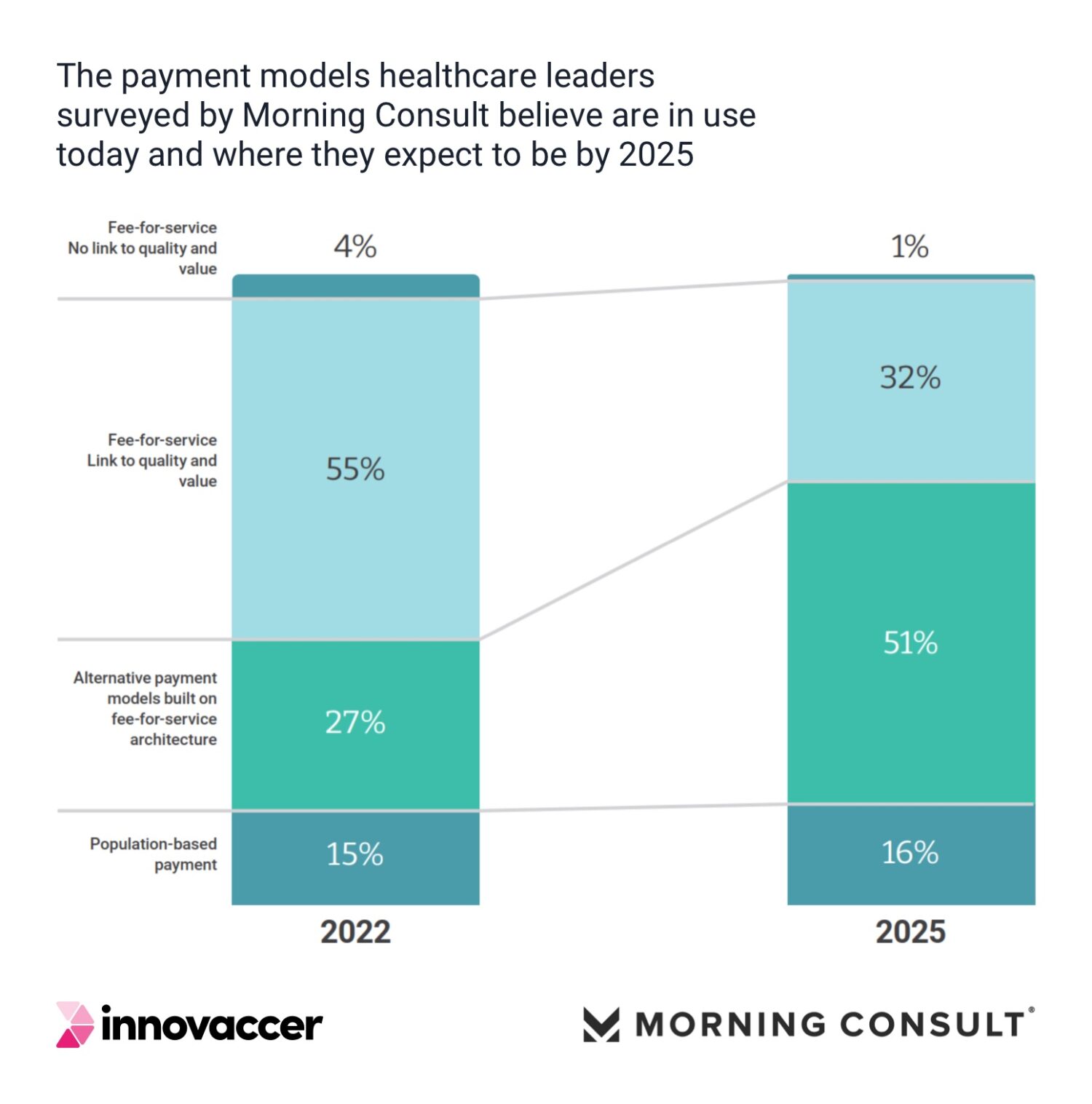Only 4% of providers today report using pure FFS with no links to quality and value, and that plummets to 1% by 2025. Providers believe the payment model that’s historically dominated in healthcare has flamed out, and that 96% of healthcare payment today has connections to care quality, cost reductions and, in some cases, patient experience. That leaps to 99% by 2025.