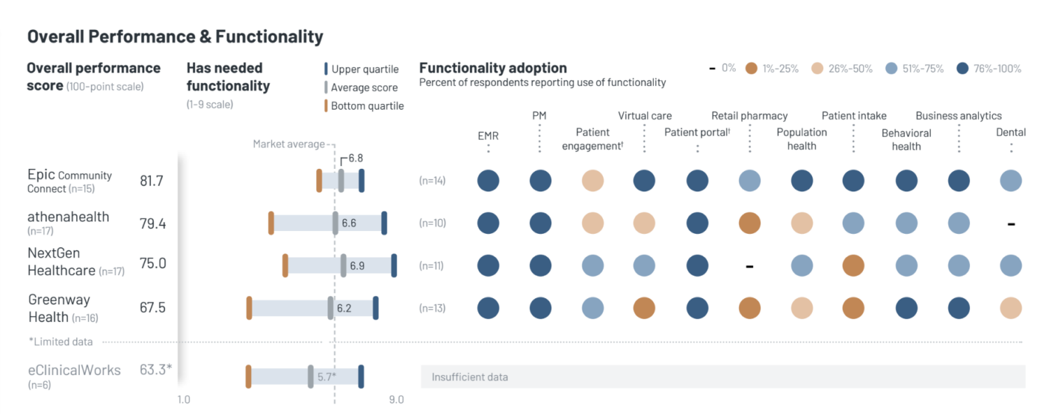- Epic Leads in Functionality Adoption for FQHCs: Epic Community Connect- Customers are most consistently satisfied with functionality and use more capabilities than other measured vendors’ customer bases. The EMR is unanimously cited as a core strength; respondents say functionality is stable, robust, and continually improved. Some note difficulties with accessing needed data and reporting for UDS measures, scanning, faxing speed, and the behavioral health and dental modules. athenahealth- Integrated EMR/PM solution is a core strength that allows FQHCs to document easily and operate efficiently. Some feel the vendor should better align the product with FQHC workflows and provide stronger UDS reporting. Virtual care is an adoption gap; customers want to do more virtual care but feel the module is too costly. Nearly 60% of respondents want the vendor to focus on improving the behavioral health module. NextGen Healthcare- Scores highest for functionality, but provider satisfaction with functionality is more variable. FQHCs say vendor’s key strength is reporting for UDS measures, A/R, and other financial metrics. Common issues among dissatisfied respondents include problems with the patient portal and insufficient patient intake capabilities. Greenway Health – Practice management system is noted as a strength and handles complex FQHC billing well; reporting is also seen as a strength. Multiple respondents report product shortcomings such as population health, patient intake, and virtual care; these FQHCs often use third parties to supplement gaps, leading to a low sense of value. eClinicalWorks (limited data) – Respondents note vendor offers a lot of functionalities for the price but that the cost is not worth the quality issues across modules. Vendor receives lowest score among measured vendors for providing needed functionality and for overall value.